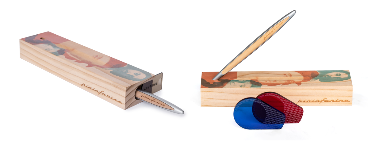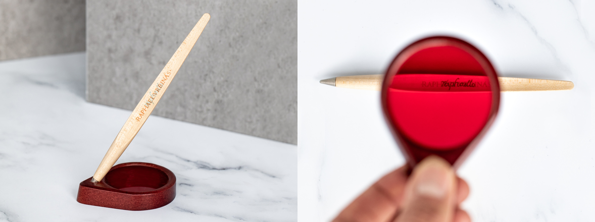 На овој стилус со динамичен облик кој потсетува на перо, целосно изработен од јаворово дрво, поставен е потписот на Рафаело, што е невидлив за голото око, а се открива ако се погледне низ вклучената поларизирана леќа, вградена во држачот за на биро.